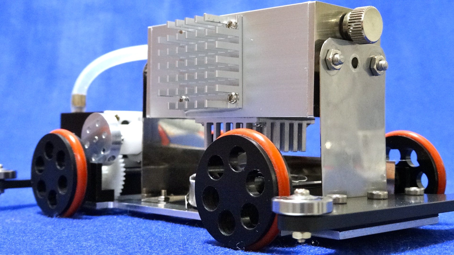津山ロボコン参加ロボットの展示。4輪オムニロボットに対して各タイヤ回転数を、差動歯車機構を用いて機械的に演算、出力します。