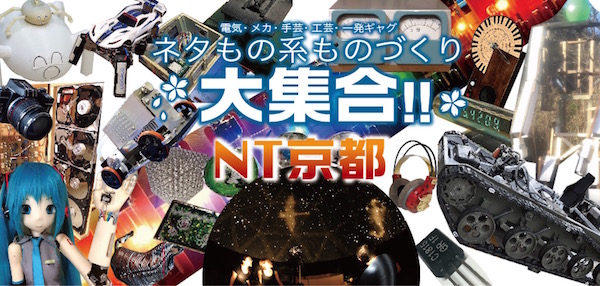 「おもしろい」と思った物を後先考えずに作ってしまう人達の作品70組超が京都西院に大集合します。毎年「訳わからんけど、おもろいな」と評判のNT京都は今年で8年目。普段はウケを狙って面白作品を開発しインターネットに動画投稿している人達(ニコニコ技術部)の有志が緩い雰囲気で運営しています。