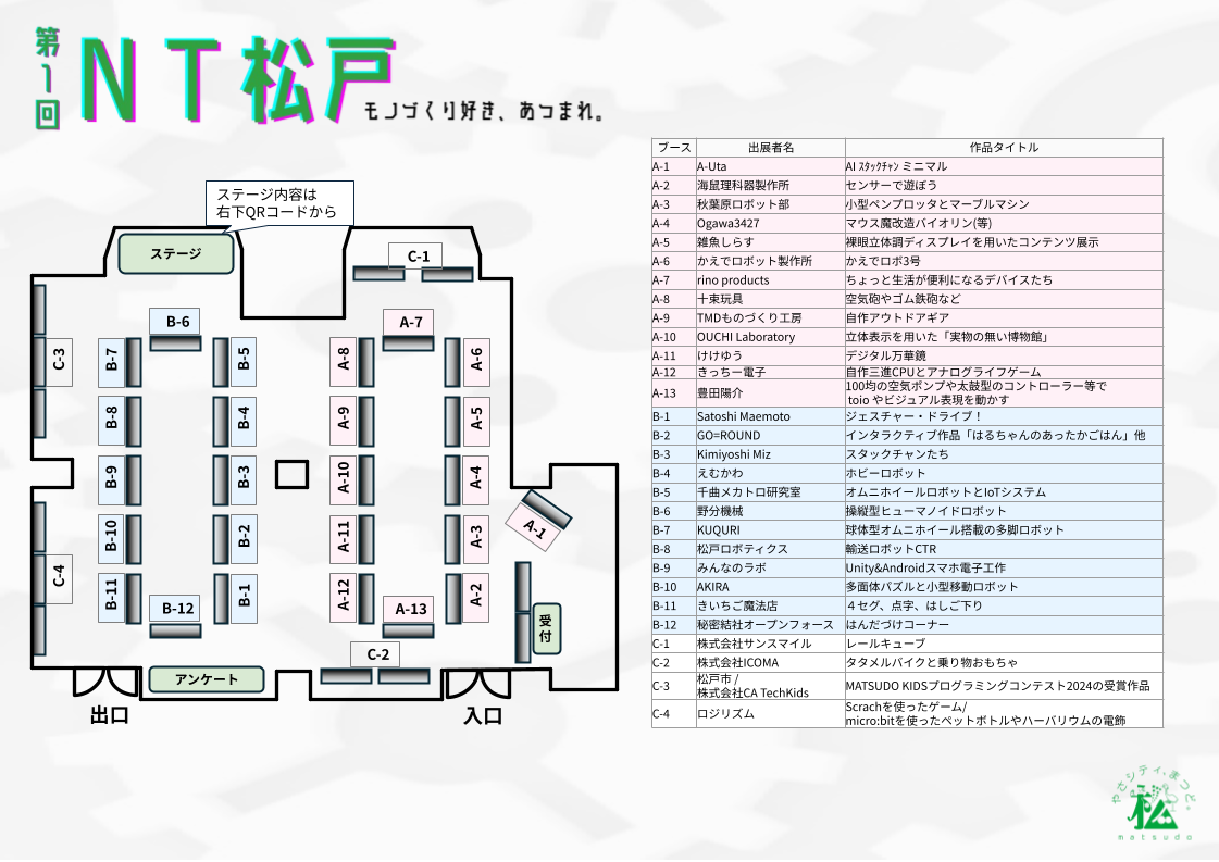 イベント概要†NTイベントを松戸で初開催します! 出展・参加、いずれも無料です! ハッシュタグ:#NT松戸 開催の背景はお世話係長の個人ブログに記載しています。 日程†2025年03月09日(日) 10:00 - 16:00 会場†キテミテマツド9F アートスポットまつど (JR松戸駅 徒歩3分) 会場配置†LTタイム†13:00から8組ほどが発表予定。 詳細はCivic Tech Matsudo-Cityのページに記載。 出展申込†出展申込は締め切りました。
