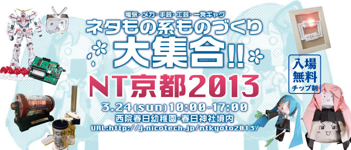 wikiの情報を大幅に更新した場合はこちらのメーリングリストで告知いたします。 メールのほうが便利な方はご登録ください。 展示情報†3Dプラネタリウムもやってくる!! 展示予定作品動画マイリスト(ニコニコ動画に公開されている動画のみ)⇒http://www.nicovideo.jp/mylist/36180641 NT京都について†↓動画は昨年度(2012)の様子です 「工作で一発ネタ」をやってインターネット動画投稿サイト(ニコニコ動画)に動画投稿していた人達が自分たちでも展示・交流会をやろう!と始めたのがNT京都をはじめとするNTシリーズです。 この生い立ちから、動画サイトなどで流行っているネタを取り込んだ工作ものが多くなっています。現在京都・名古屋・金沢で定期開催している他、首都圏でも不定期にに行われています。