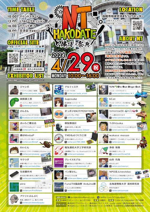 NT(Nanka Tukuttemita)函館(2024)†イベント概要†開催日時:2024/4/29[月祝] 10:00-16:00 GW...函館では花見の時期ですが、このタイミングでNTを始めてみたいと思います。 情報の優先順位(※):公式WEBサイト > Wiki ※速報性の高い情報や、緊急情報は X (Twitter) にて先にお伝えする場合があります 公式サイト:https://sites.google.com/view/nt-hakodate/ 目次†場所†本会場:函館市地域交流まちづくりセンター†(函館市末広町4-19) (函館市電「十字街」電停 目の前) 打上会場:五稜郭公園†(会場から市電25分+徒歩で15分くらい)の桜の下でブルーシートを敷いてジンギスカンを予定しております(変更の可能性有・雨天時は別会場にて行います) 公開データ†チラシ・プレスリリース†https://sites.google.com/view/nt-hakodate/press スケジュール†本会場では、イベント開催時以外は作品紹介などを流す予定です。 4/28(日) 準備日†出展者設営時間 15:00-21:00 ※入退出自由
