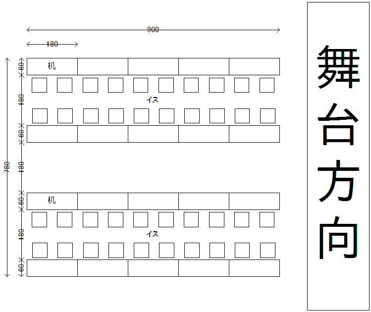 展示スペース部分の椅子・机の配置図です。まだ展示者が確定していないので案となりますが、基本的にこういった感じになるとおもいます。