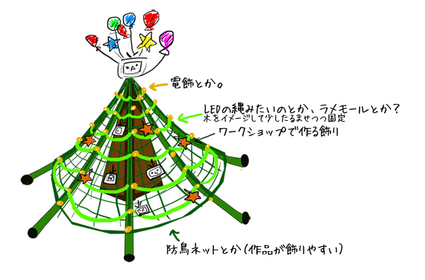 タワーの飾りは持ち込み(事前申込)とワークショップにて作る。