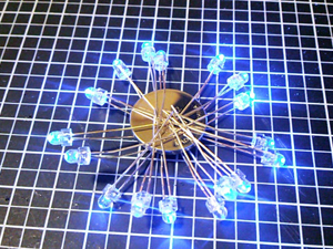 - 平ラグ板にトランジスタその他数点の部品をはんだづけし、LEDフラッシャー(Lチカ)を製作します。多数の来場者におひとり様1つずつ製作いただき、それらを数珠つなぎにしてタワーに飾ります。