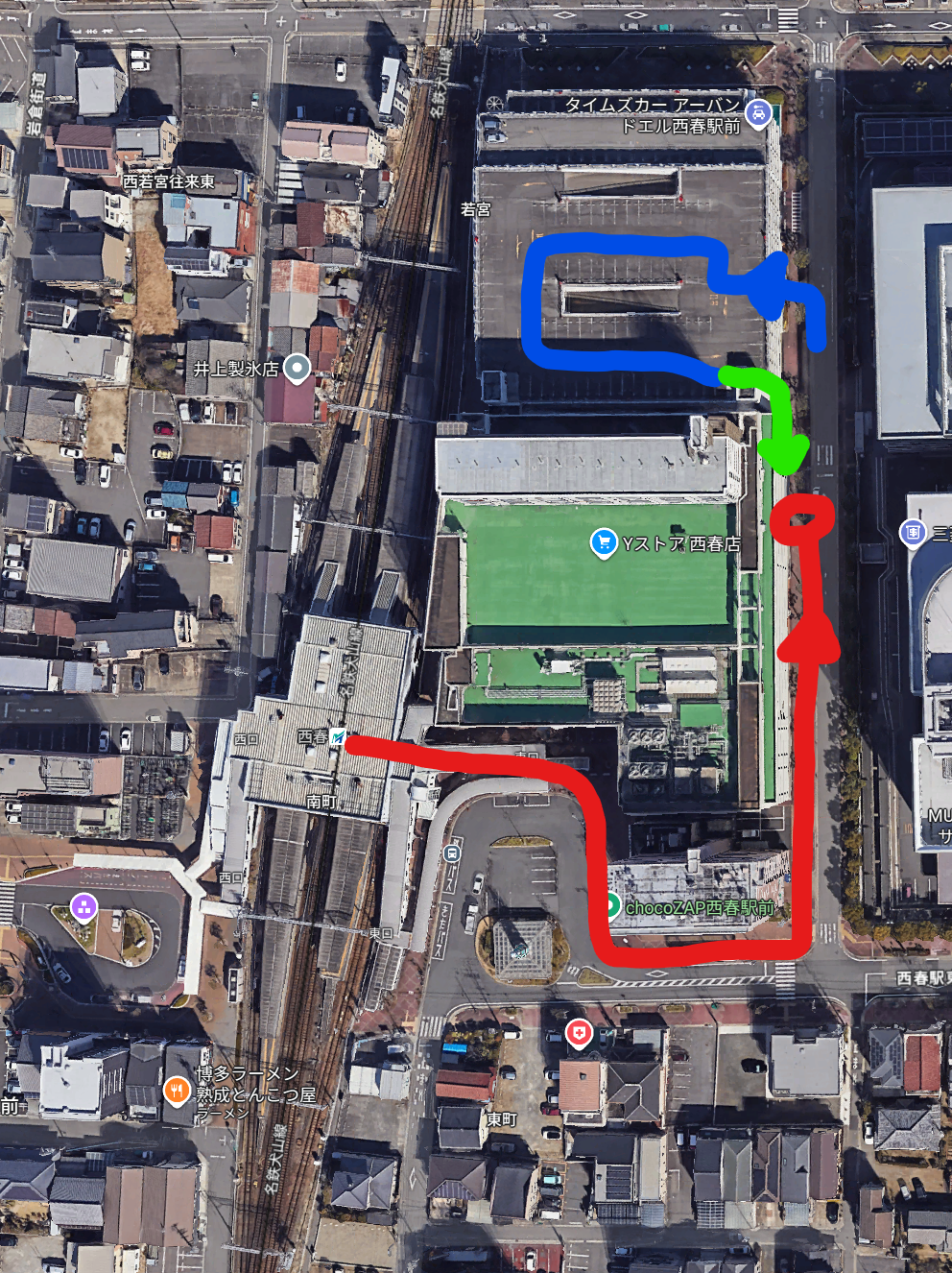 ・クルマでお越しの方は、青線のとおり ヨシヅヤ隣接のタイムズ駐車場に駐車してから, 緑線のとおりに徒歩で集合場所に来てください。(展示物は持ってこない方が良いです。)