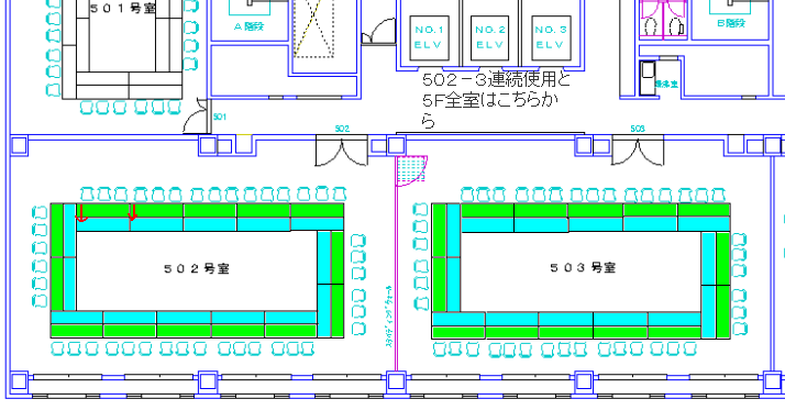 緑の机と水色の机は種類が違います。また、赤色の矢印で示した向きに設置します。